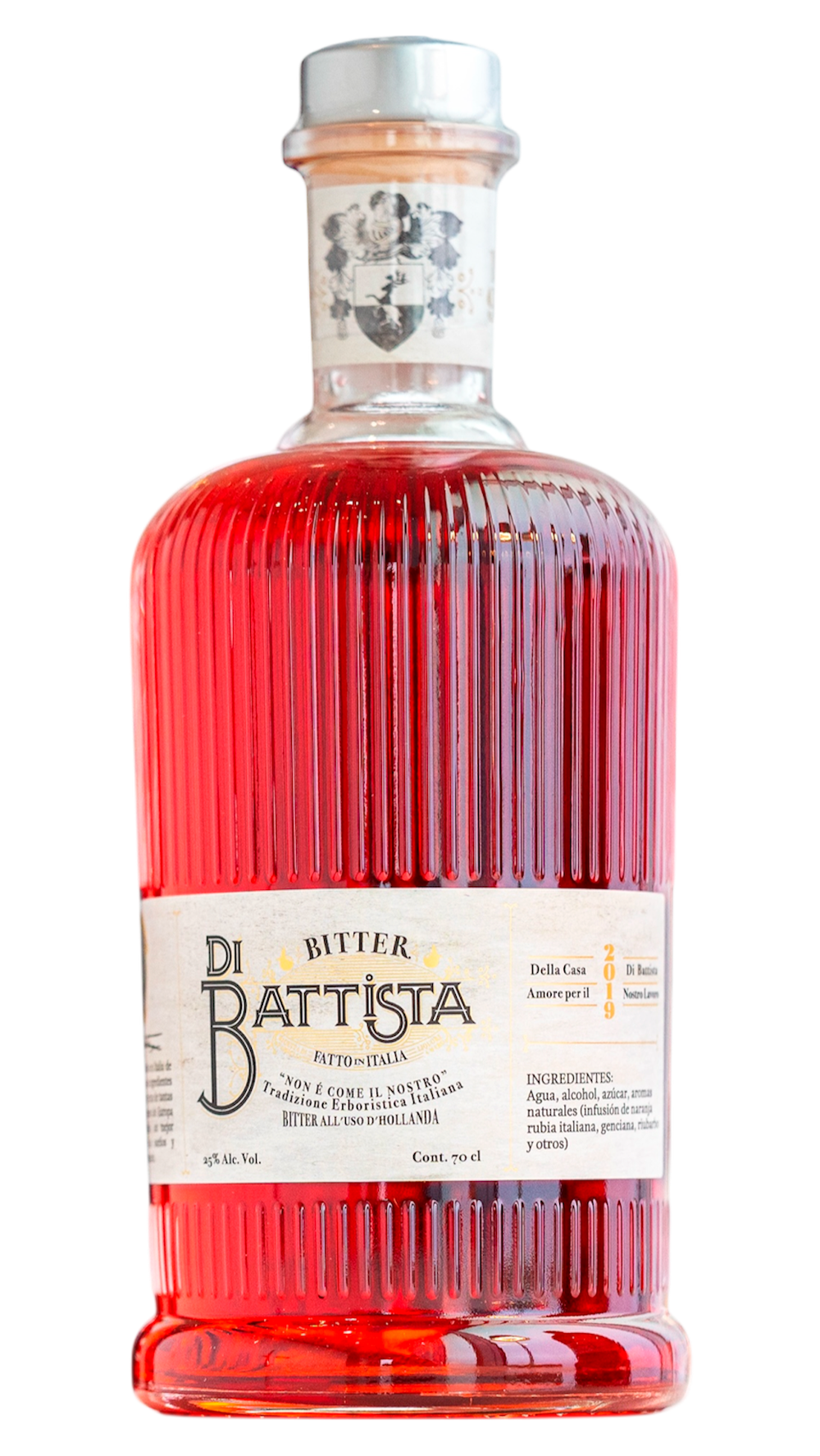 Di Battista se elabora con Genciana, Ajenjo, Ruibarbo y dos tipos de naranjas rubias italianas: de Calabria y de Sicilia. Es la suma de sus ingredientes la que le da su toque amargo y floral.